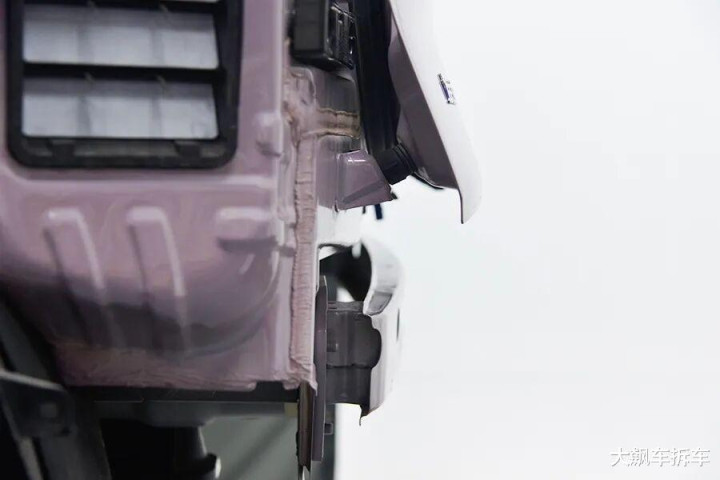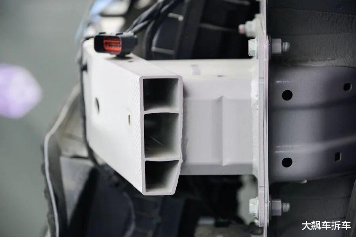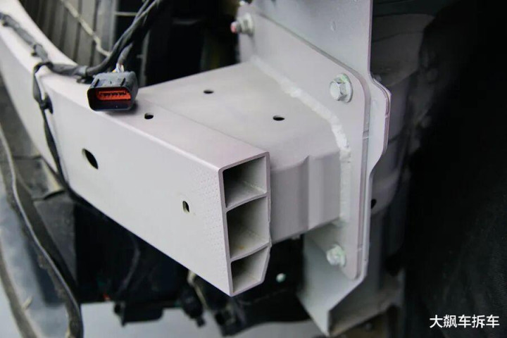 前吸能盒也是铝合金材质,不仅有溃缩打孔,而且还有扩缩褶皱,这在同级别车型当中,非常少见!