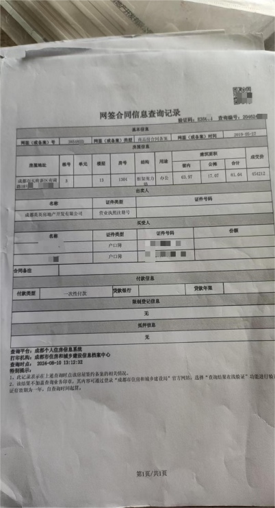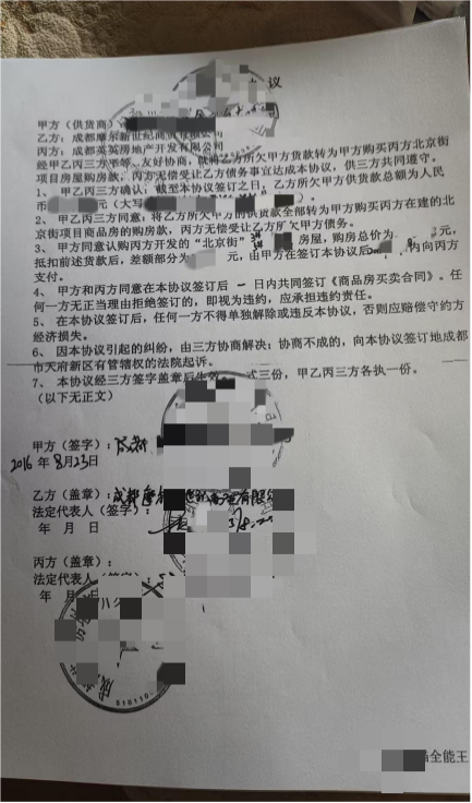走投无路之下,三方签订《三方协议》,约定以英英地产“北京街”项目的房屋抵顶全部欠款。拿到协议的那一刻,供货商们以为终于看到了希望——他们逐一与英英地产签订《商品房买卖合同》,明确“货款足额冲抵房款”,网签前所有欠款已全额抵付,随后全部完成网签备案,这可是住建部门认可的行政公示,是他们权益最坚实的保障。2019年起,供货商们陆续收房,按时缴纳物业费,手中握着完整的合同、网签凭证和物业费发票,房屋实际占有状态也得到了物业盖章确认。他们以为,这下终于能安心了,这房子是用十年血汗换来的“定心丸”。